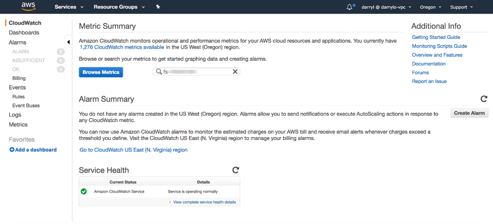 I open the Amazon CloudWatch console, enter my file system ID in the browse field, and press Enter.