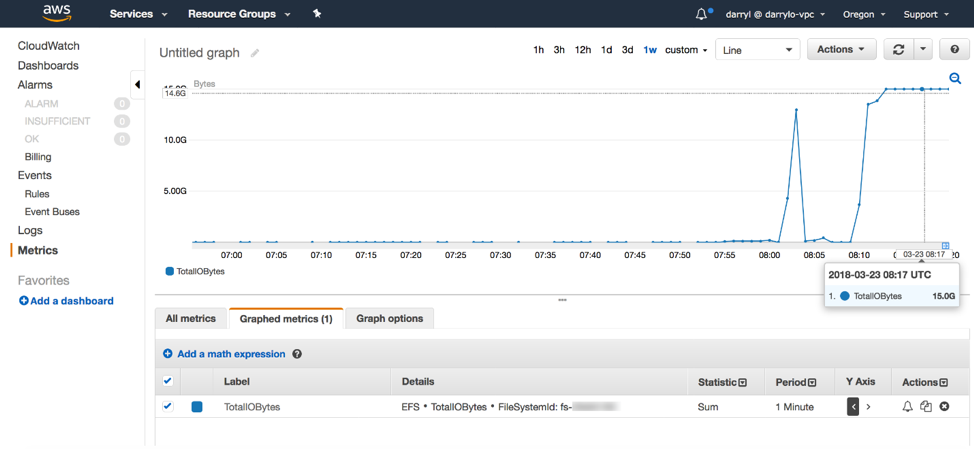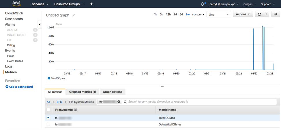 I choose EFS > File System Metrics then select the check box next to the TotalIOBytes metric name.
