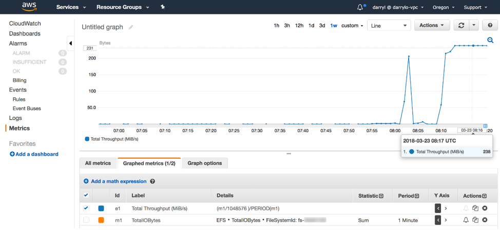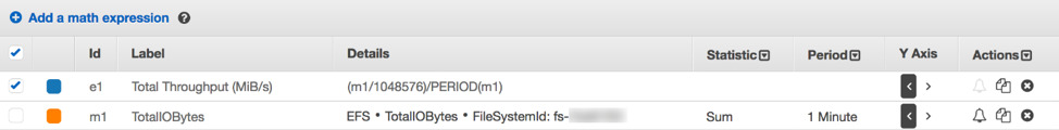 I optionally add the label Total Throughput (MiB/s) to make it easier for me to remember what the metric represents and enter the math expression in the Details field. This calculation takes the metric Id m1, which is the sum of TotalIOBytes for 1 minute, converts it to MiB by dividing by 1048576, then divides by the number of seconds in the PERIOD of metric Id m1. I unselect the check box of the m1 (EFS * TotalIOBytes…) metric so it doesn’t display in the graph. Now I have all the data points in this time series displaying total throughput in MiB/s.