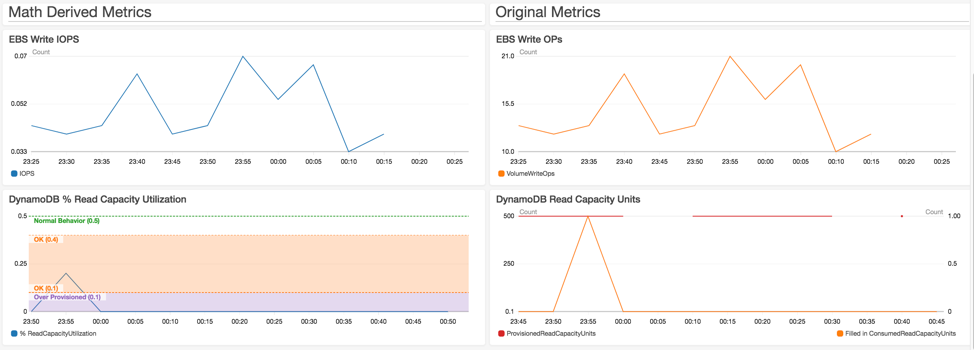 With CloudWatch Metric Math, you can now easily convert your CloudWatch metrics such as count of errors or database total IO bytes to metrics that give you a sense of scale and speed, like IOPS, throughput, and percent error rate metrics. In addition to rate and throughput metrics, you can also aggregate individual resource metrics into a cluster or fleet-wide view by using functions as such SUM on a group of metrics. Metric Math supports simple mathematical operations such as addition, subtraction and functions such as SUM, ABSOLUTE, STANDARD DEVIATION, and more. For sparse metrics that publish values at irregular intervals, such as HTTP error counts, you can use a FILL function to fill in default values such as zeros for empty values to make the metric easier to perform math on or to graph. You can create these metric math expressions directly in the CloudWatch console or by using the new GetMetricData API operation which allows for both metric math retrieval and bulk metric retrievals.