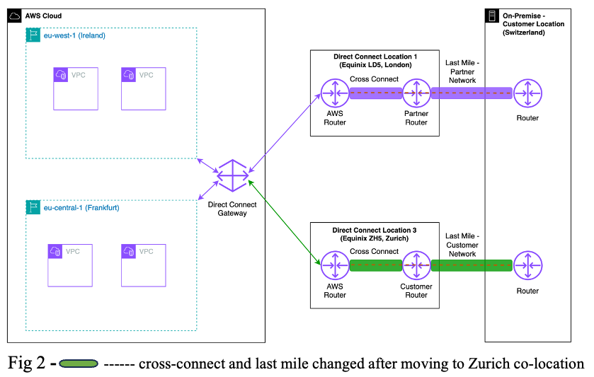 Since the organization already had last mile access to Zurich and a router at the same co-location facility, they chose to utilize the new Zurich Direct Connect location 3 for one of their two connections. This reduced dependency on a single partner, lowered costs by eliminating one last mile partner network, and improved overall network resilience.