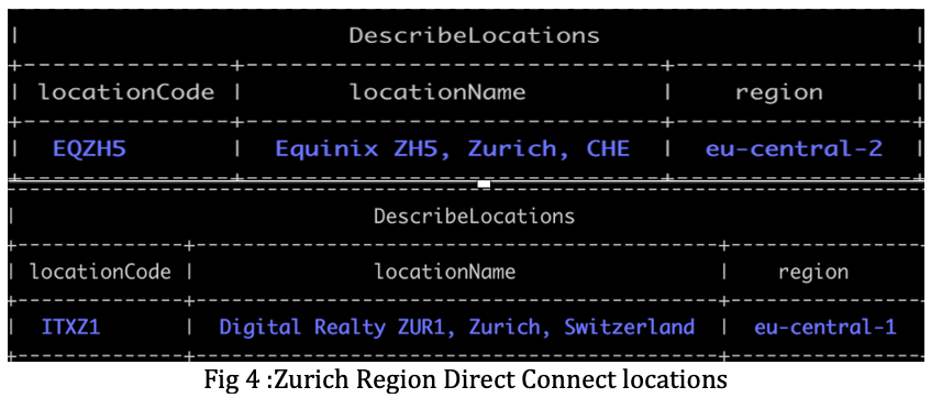 The output shows (Fig4) Equinix ZH5 is associated with Europe (Zurich) – eu-central-2 while ZUR1 is associated with Europe (Frankfurt) – eu-central-1. This is just for the interal management purpose and doesn’t mean your traffic in ZUR1 location will be routed to Frankfurt if your workload on AWS are hosted in AWS Europe (Zurich) region. The traffic in AWS backbone always takes the shortest path to the destination.