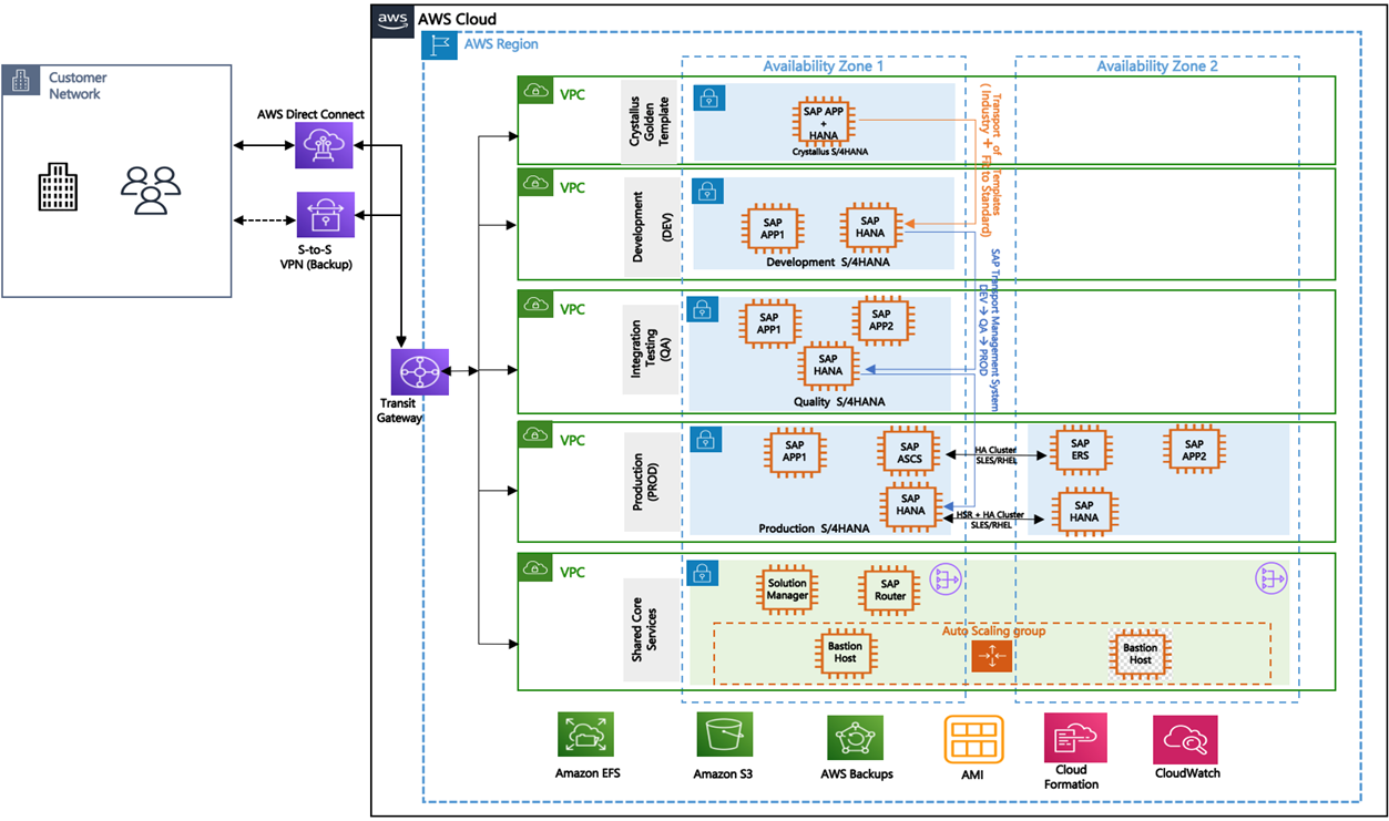 Below is a sample architecture which depicts the details of how TCS Crystallus on AWS as a reference system is deployed on AWS in a customer landscape, along with non-production and mission-critical production SAP systems.
