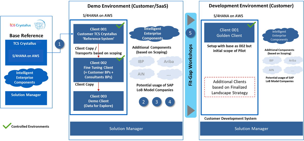 Below are the steps which transition TCS Crystallus S/4HANA from a base reference system to a customer’s SAP production landscape: