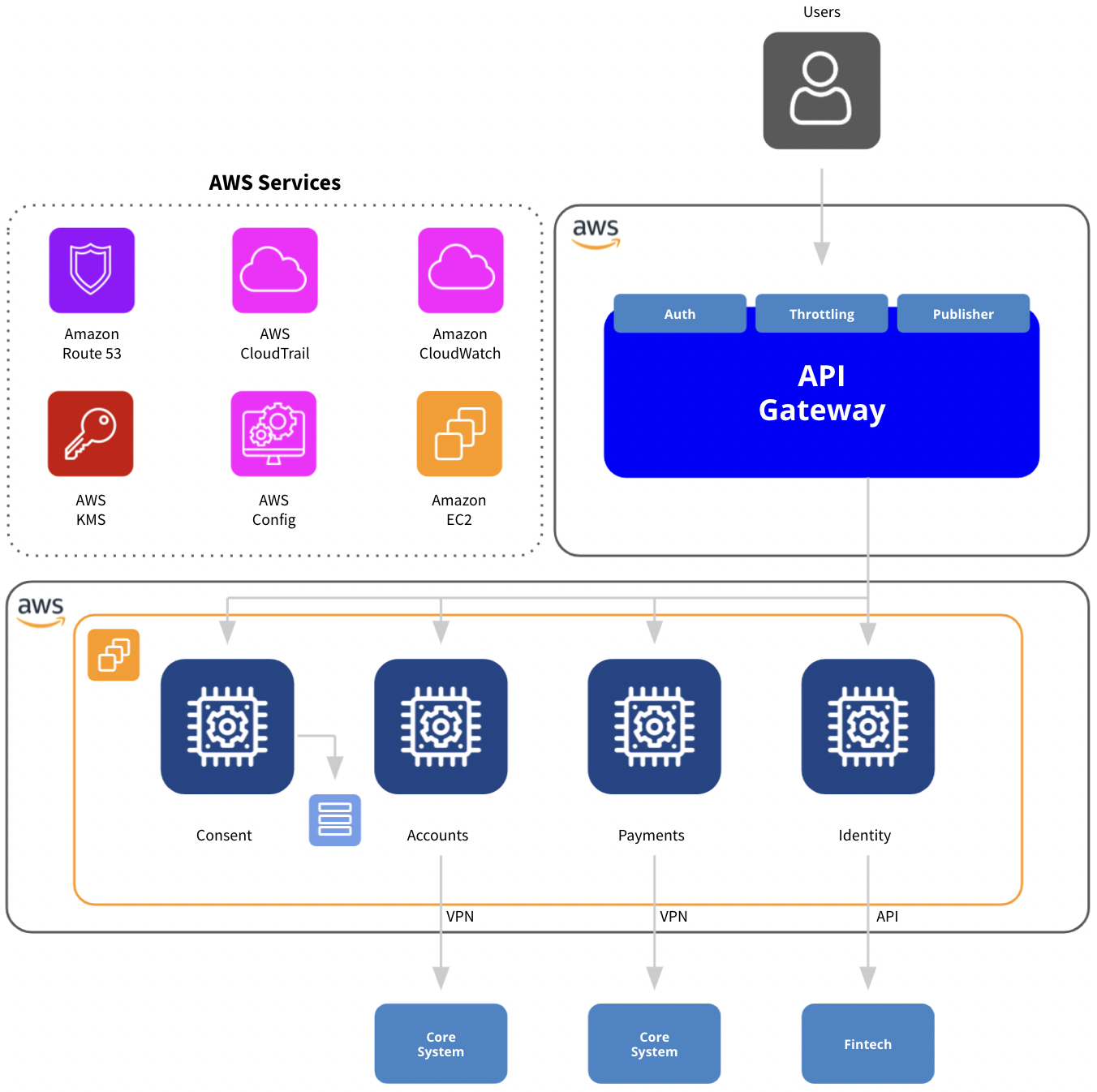 Based on a cloud infrastructure built on top of a wide range of AWS services, Open Finance enables financial institutions to implement their own open banking solutions. This supports a comprehensive set of normalized APIs and a complete portfolio management tool for administering third-party solutions, including robust tracing of progress, metrics, and key performance indicators.