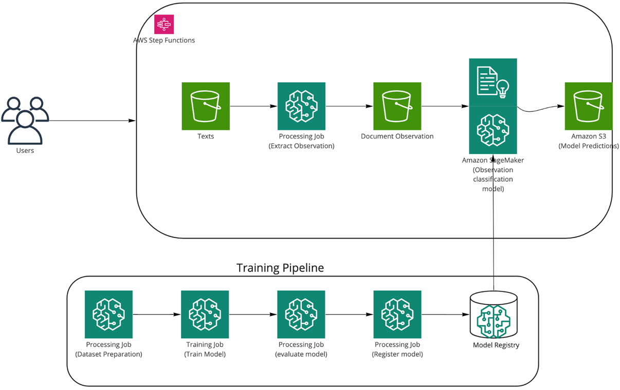 - Amazon S3: Used as a data lake to store texts, document observations, and model predictions.