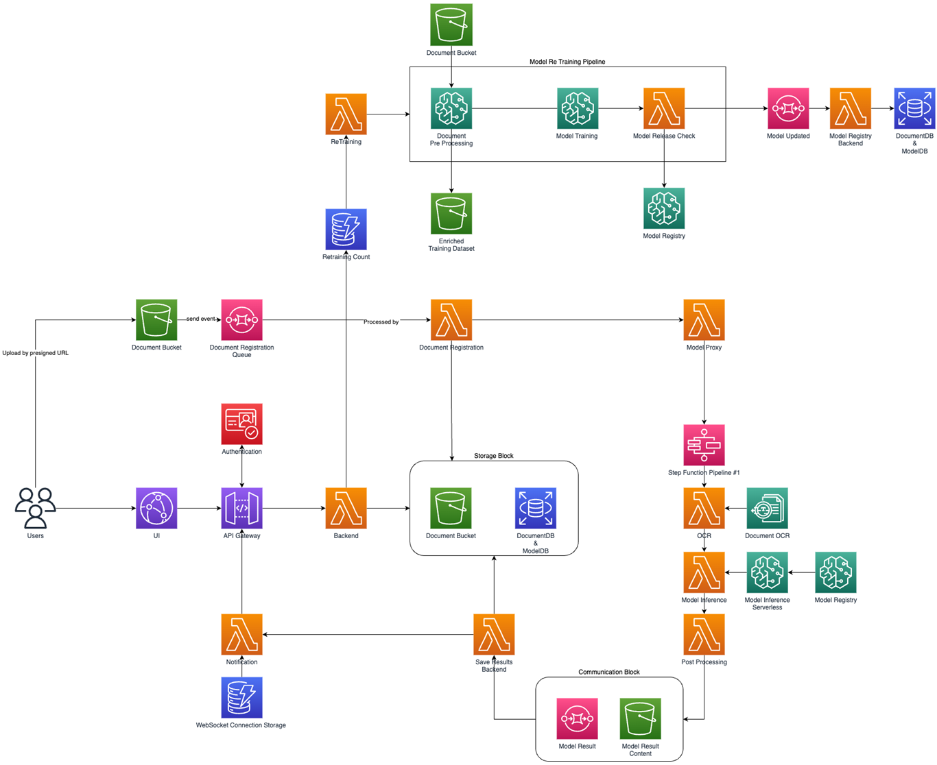 - AWS Lambda: Provided access to a complete API that enabled it to handle documents, including user engagement with documents and their processing by ML models.