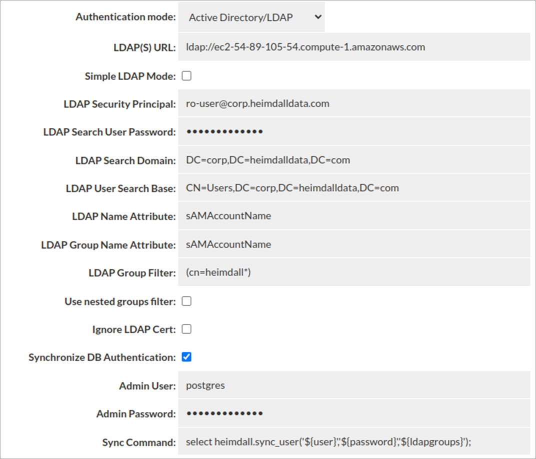 The benefit of full integration with AD is to allow authentication of users and remove the burden to manage users on the databases. Instead of preconfiguring users, the Heimdall Proxy synchronizes user information as needed out of Active Directory into the database so that access control is maintained.
