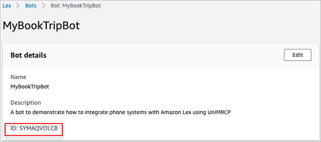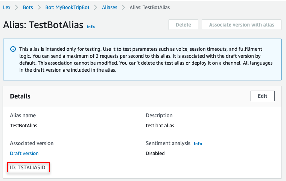 Figure 5 – Bot alias details section showing the bot alias ID.