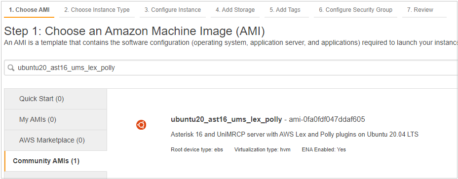 - On the Amazon Machine Image selection screen, search for the public image with AMI Name: ubuntu20_ast16_ums_lex_polly, or AMI ID: ami-0fa0fdf047ddaf605. You’ll find one result in community AMIs.