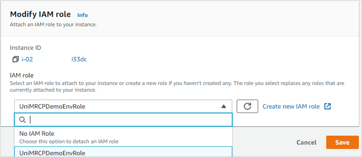 - After you have finished, go to the EC2 UniMRCP server instance details, select Actions > Security > Modify IAM role, and set the IAM role to the one you created in the previous step.