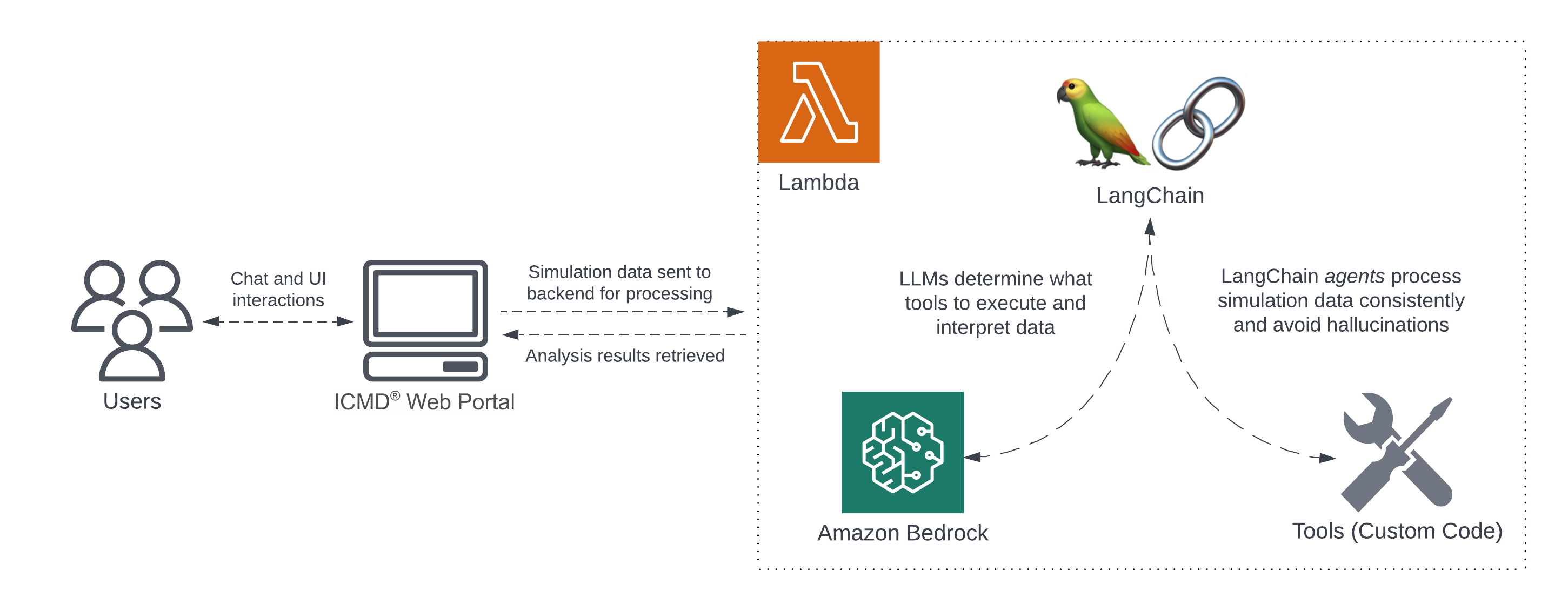 For the generative AI analyzer, AllCloud leveraged Amazon Bedrock and LangChain agents. Traditionally, LLMs have difficulty with mathematical and scientific reasoning. Using agents, AllCloud developed a tool for QuesTek to combine the power of natural language understanding by LLMs (such as Anthropic’s Claude 3 Opus) with the accurate and consistent code execution of agents on material’s science data.