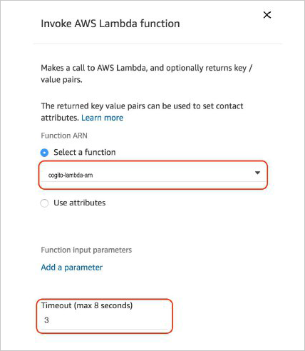 - When adding the Invoke AWS Lambda function block, specify the Cogitator-provided Lambda ARN in the Function ARN field.