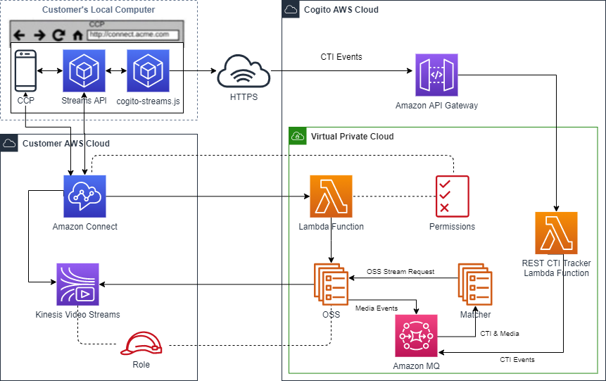 In order to receive CTI events, Cogito integrates with the Streams API used to control integrations of the Amazon Connect Contact Control Panel (CCP).