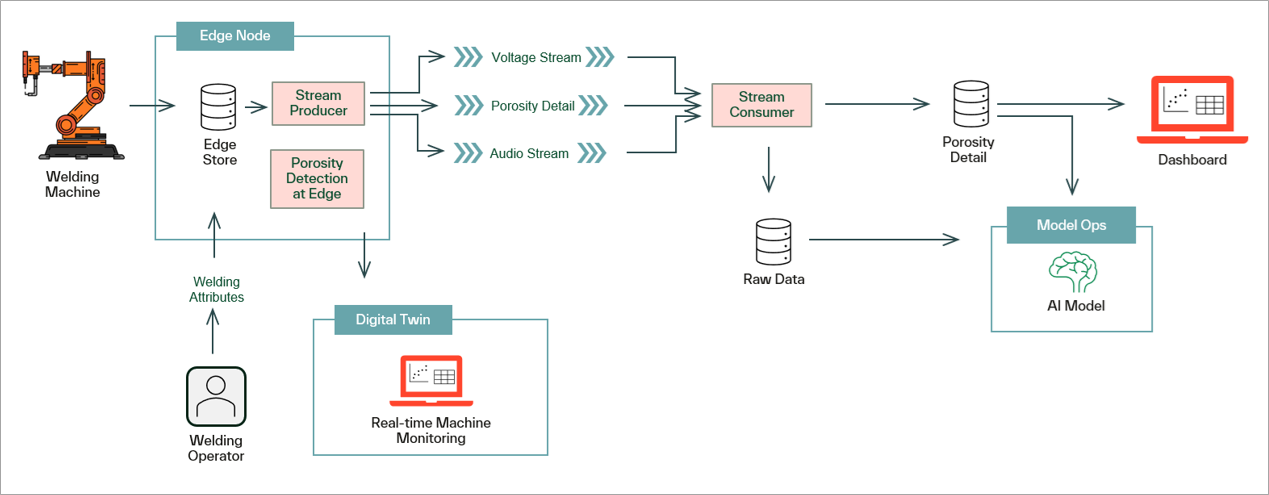Kyndryl’s solution flow consists of collecting acoustic data with voltage and current from welding machines, processing and inferencing data at the edge to detect welding pores while providing actionable insights to welding operators.