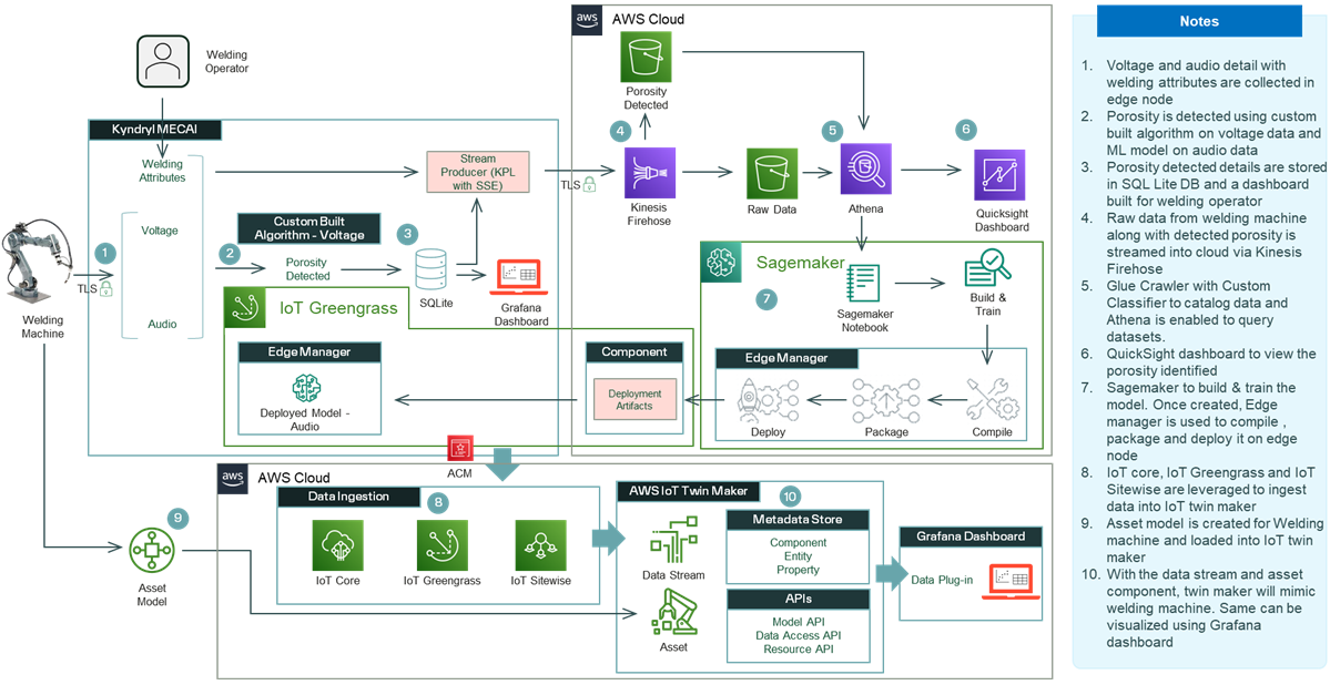 In this post, we will discuss an AI-based solution Kyndryl has built on Amazon Web Services (AWS) to detect pores on the welding process using acoustic data and a custom-built algorithm leveraging voltage data. We’ll describe how Kyndryl collaborated with AWS to design an end-to-end solution for detecting welding pores in a manufacturing plant using AWS analytics services and by enabling digital twins to monitor welding machines effectively.