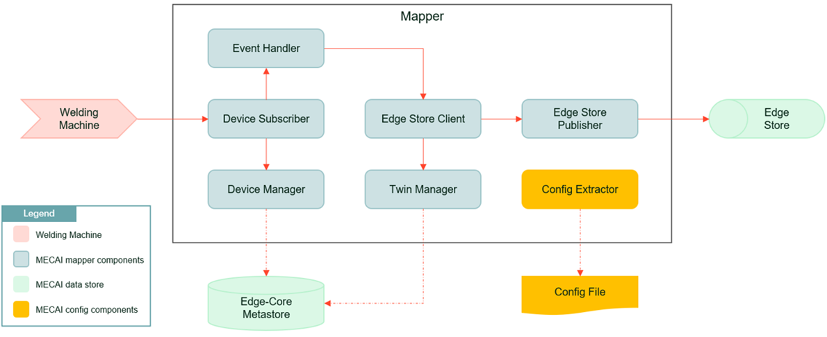 The MECAI wrapper helps connect the welding machine for data collection and manages the connectivity between the machine and edge node. It also handles the availability of the edge node and restoration of its last known good configuration in the event of failure. This is achieved by having a high available cloud instance synchronized continuously with the edge node.