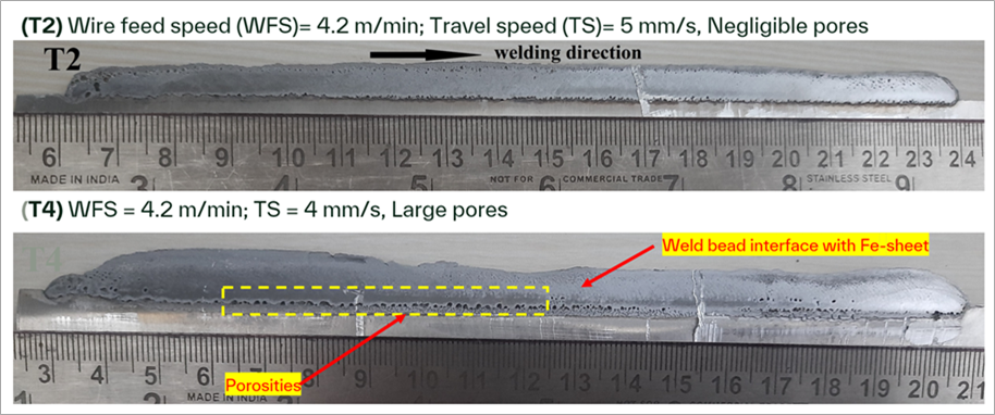 A sample of negligible pores and large pores of cold metal transfer (CMT) welding process is shown below.