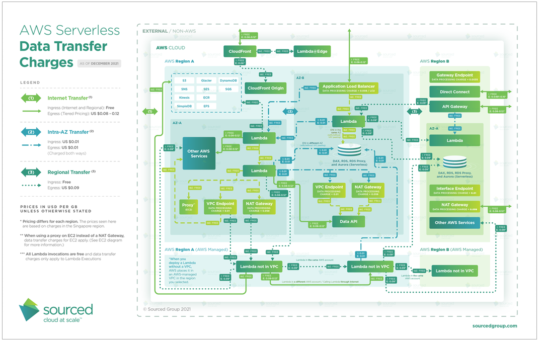 In this post, we’ll provide an updated version of the server-focused data transfer costs that others have created and shared in the past. Sourced Group, an AWS Premier Tier Services Partner, also created an entirely new visual for its own training materials that is focused on the AWS data transfer costs relevant to serverless architectures.
