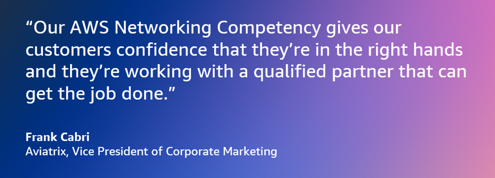 “Our AWS Networking Competency gives our customers confidence that they’re in the right hands and they’re working with a qualified partner that can get the job done,” says Frank Cabri, Vice President of Corporate Marketing at Aviatrix. Read the full case study >>
