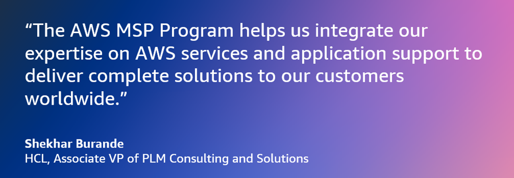 “The AWS MSP Program helps us integrate our expertise on AWS services and application support to deliver complete solutions to our customers worldwide,” says Shekhar Burande, Associate VP of PLM Consulting and Solutions at HCL. Read the full case study >>