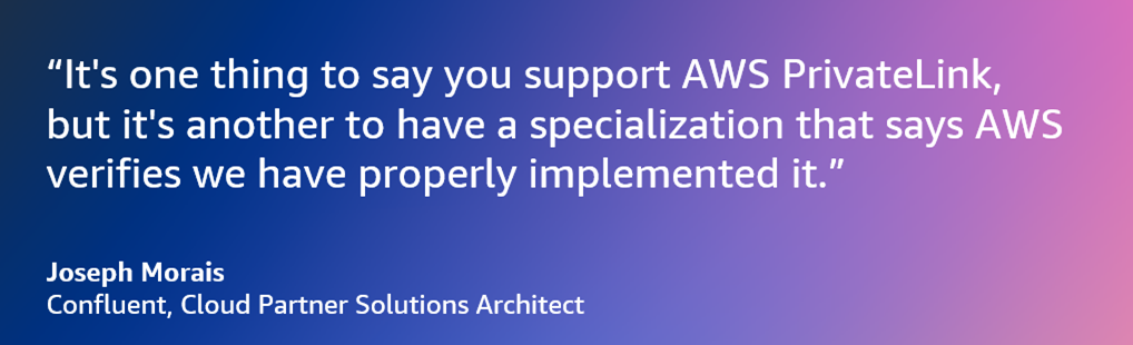 “It’s one thing to say you support AWS PrivateLink, but it’s another to have a designation that says AWS verifies we have properly implemented it,” says Joseph Morais, Cloud Partner Solutions Architect at Confluent. Read the full case study >>