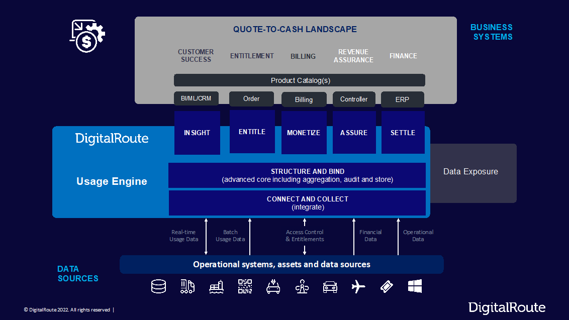 DigitalRoute’s Usage Engine unlocks the value of usage data to optimize business outcomes. See Figure 1 for an industry-agnostic overview of where DigitalRoute’s Usage Engine fits into a customer’s quote-to-cash landscape.