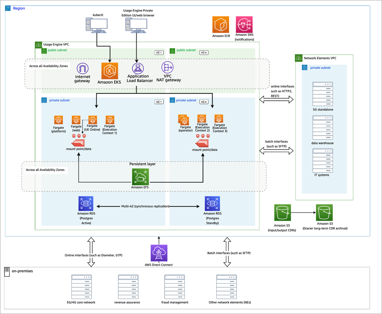 For redundancy, all backing services run across multiple AWS Availability Zones (AZs) for regional redundancy and disaster recovery. This is always the case for Usage Engine Private Edition, whether using AWS Fargate or not.