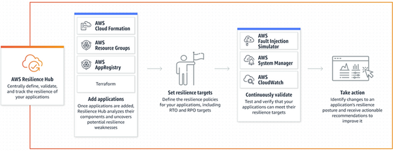 AWS Resilience Hub gives you a central place to define, validate, and track the resiliency of your applications. It helps optimize business continuity in addition to meeting compliance and regulatory requirements by evaluating your infrastructure and suggesting recommendations to improve resiliency. It also provides code recommendations for implementing tests, alarms, and SOPs you can deploy and run in your integration and delivery (CI/CD) pipeline.