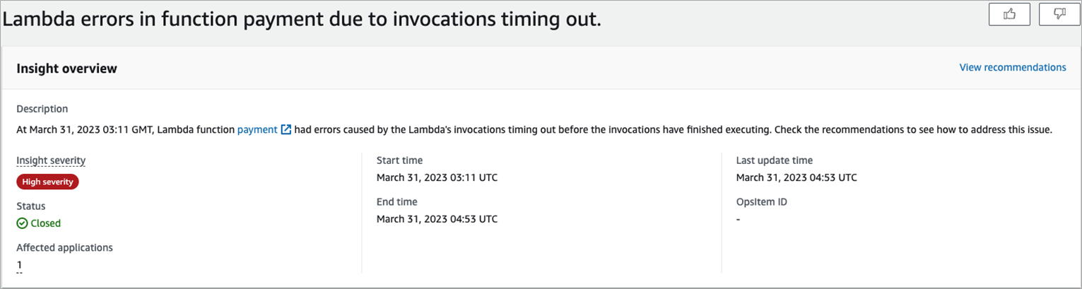 In the following image, DevOps Guru shows an insight with high severity due to invocations timing out.