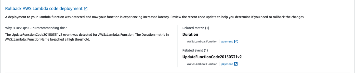 On the same page, DevOps Guru shows recommendations to solve the problem, such as a rollback (remember the error was caused by uncommenting the line in payment service), which is the right solution to the problem. After the rollback, wait a few minutes and DevOps Guru will show the insight was closed.