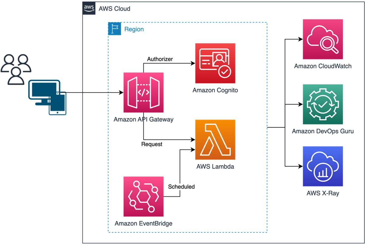 One of the relevant services of this architecture is Amazon DevOps Guru, a machine learning (ML) service designed to detect anomalous behavior patterns by identifying problems and recommending how to solve them.