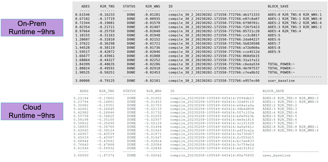 The test design parameters comprised of a CPU block with 5nm technology and 150,000 instances. For compute, we used 30 EC2 instances with eight cores per job for two efforts on compile, clock, and route slices which yielded 75% reduction on total negative slack (TNS) and 21% on design rule check (DRC).