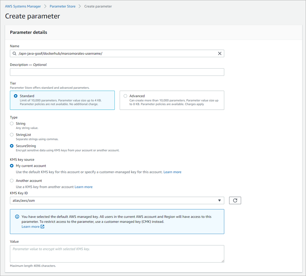 | DOCKERHUB_USERNAME | AWS Systems Manager Parameter for your username (e.g. /apn-java-goof/dockerhub/marcomorales-username) | Parameter |