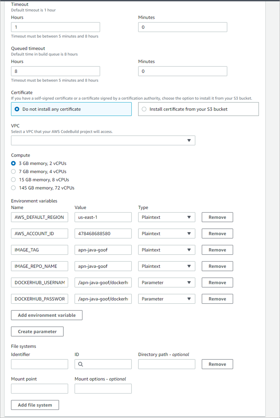 In this second CodeBuild image (Figure 7), we use the default timeout and compute sizes but specify custom environment variables. These environment variables are summarized in the next table with the name of the variable, the value, and whether this is a plaintext value or Parameter. The Parameters are the encrypted values we setup for DockerHub.