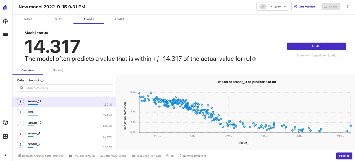 • Build: In this step, we choose our target column and the type of prediction task. In our case, it’s the column for “rul” and “Numeric” prediction (basically, Regression). We then choose how to build our model, either a quick vs. standard build. For the sake of this explainer, we choose a quick build. It’s worth noting we can select features for training by simply marking them.