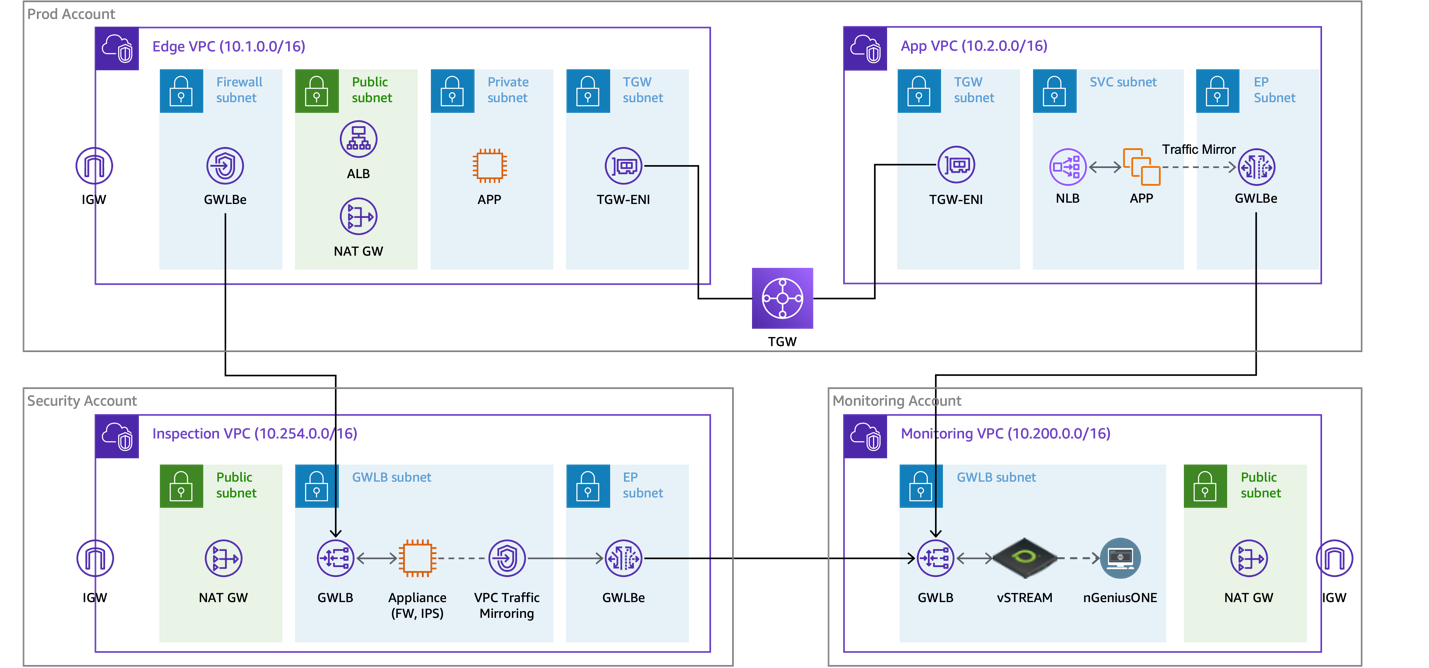 With this solution, you can centralize mirrored traffic to monitoring appliance from any account or VPC with private connectivity using a GWLB endpoint. As GWLB manages deployment, scalability, availability of appliances, it enables you to focus on network observability over appliance management to network administrator, system operator, and NetSecOps engineer.