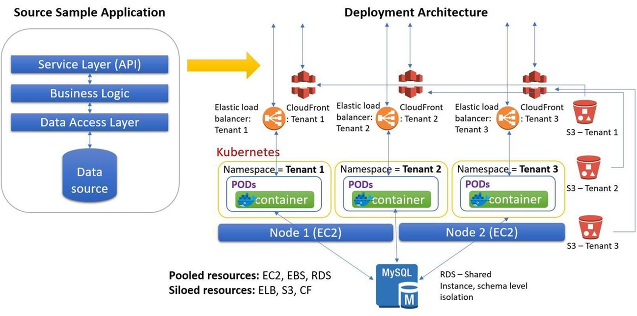In this ecosystem, from a tenancy standpoint, Amazon EC2, Amazon Elastic Block Store (Amazon EBS), and Amazon Relational Database Service (Amazon RDS) are pooled (shared) AWS resources, while ELB, CloudFront, and Amazon S3 buckets are tenant-specific siloed resources.