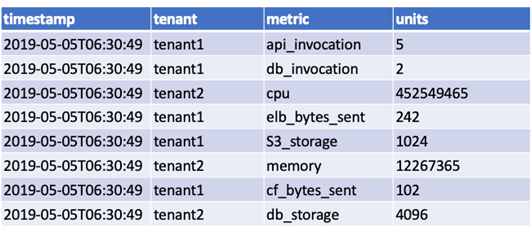 . - Depicted below in Figure 6 is an aggregated and filtered view of the ‘metrics’ table. The rows in the table are filtered for metrics that only influence the Amazon EC2 cost and are within the given time period. The filtered rows are then aggregated for each metric and tenant.