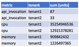 The unit of measurement for a metric is determined by its type. For example, if the metric is ‘s3_storage’, the units represent the amount of storage consumed in bytes. If it’s a ‘cpu’ metric, it represents the cumulative number of millicores of CPU units consumed by the Kubernetes pods for a particular tenant. If it’s ‘api_invocation’ or ‘db_invocation’, it represents the execution time of the request in milliseconds.