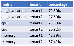 Now, armed with the metrics consumption data for tenants from the ‘metrics’ table in Figure 4, the weights assigned for each metric that influence the cost of AWS resources in the ‘metric_weight’ table, and the actual AWS bill for each AWS resource from the AWS Cost Explorer API, we can deduce the apportioned cost per tenant for each of the AWS pooled resources.