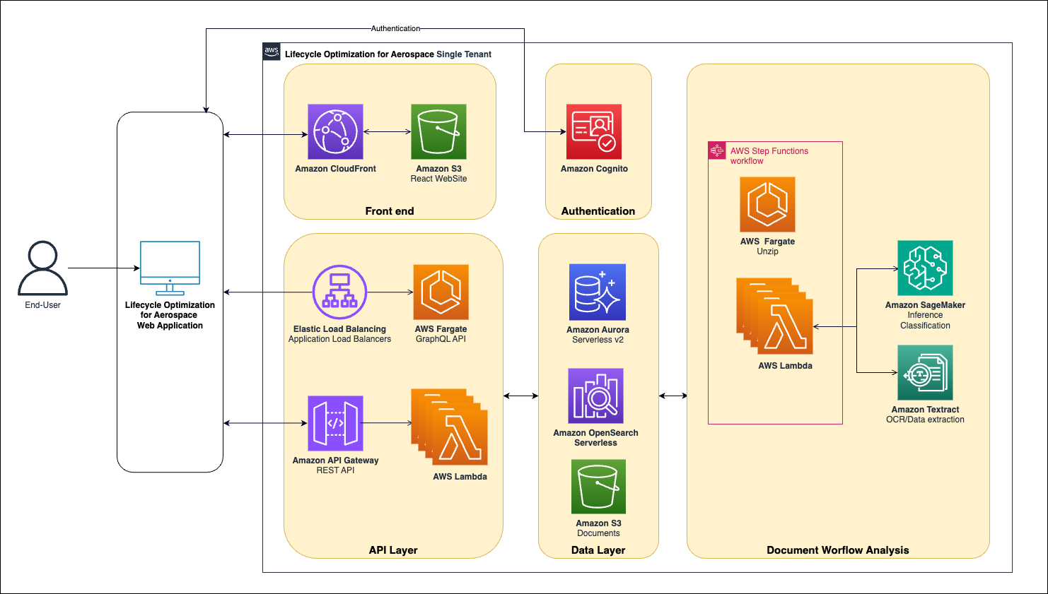 Figure 1 shows the high-level architecture of the Lifecycle Optimization for Aerospace solution, as well as the AWS services used.