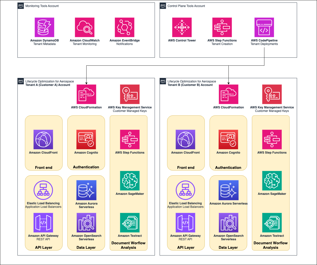 The solution achieves serverless and siloed multi-tenant architecture using AWS Control Tower. This enables the solution to be deployed on different AWS accounts for different customers using AWS CloudFormation, AWS Cloud Development Kit (AWS CDK), and AWS CodePipeline.