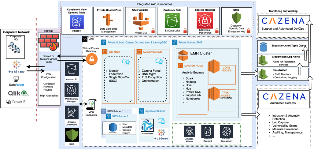 In addition to capacity and compute provisioning, the data lake is provisioned with a set of Cazena-specific services that provide the backbone of Cazena orchestration, SSO, and identity federation.