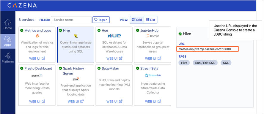 The Cazena console provides links to a wide variety of tools and applications, as well as connection strings for JDBC or ODBC connections. Simply configure the connection strings using the Cazena-supplied private IP (or URL) and provide proper authorization. It’s also possible to add custom or proprietary applications via Cazena’s AppCloud.