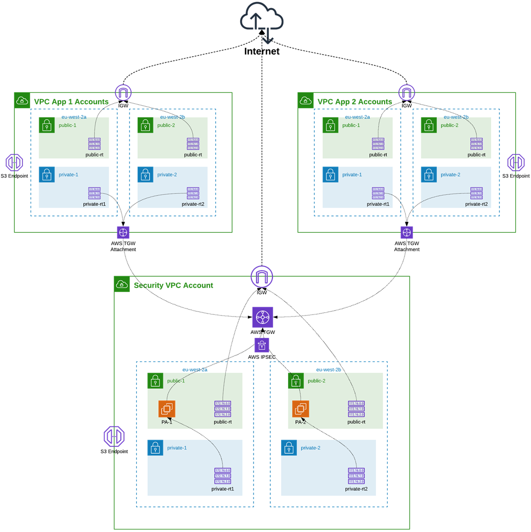 In the next sections of this post, I will share some of the questions we have asked ourselves at SoftwareOne. I will also explore the decisions we took while migrating from centralized north-south inspection with Transit Gateway VPN attachments (Figure 1) to centralized inspection with GWLB in front of the Palo Alto VM-Series Firewalls (Figure 2).