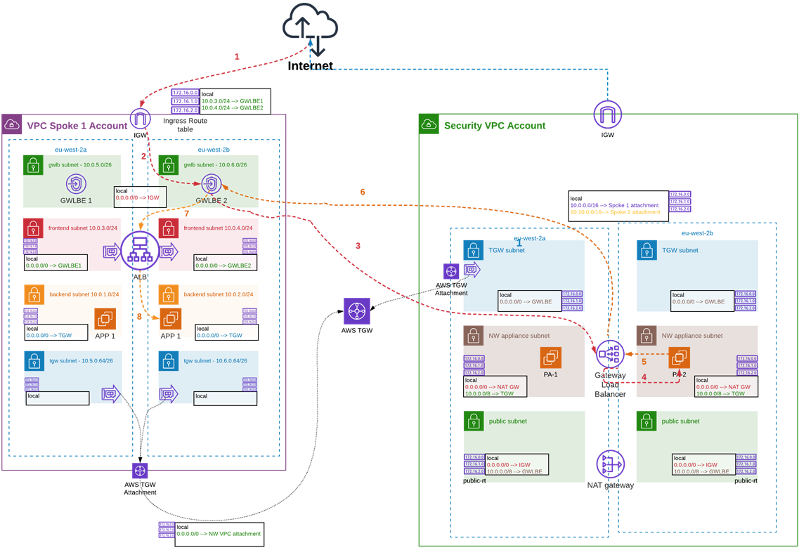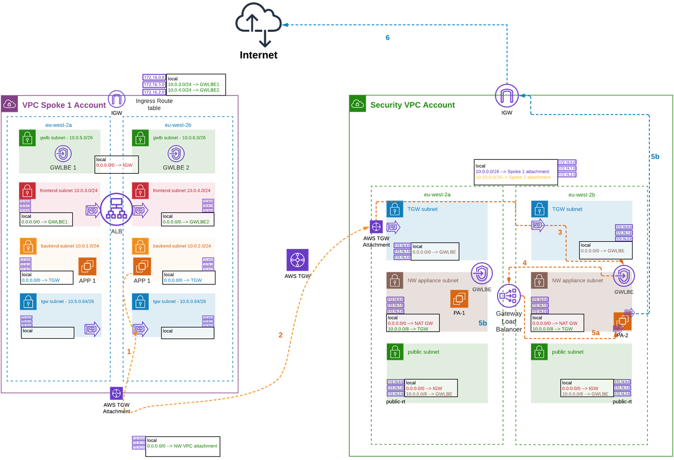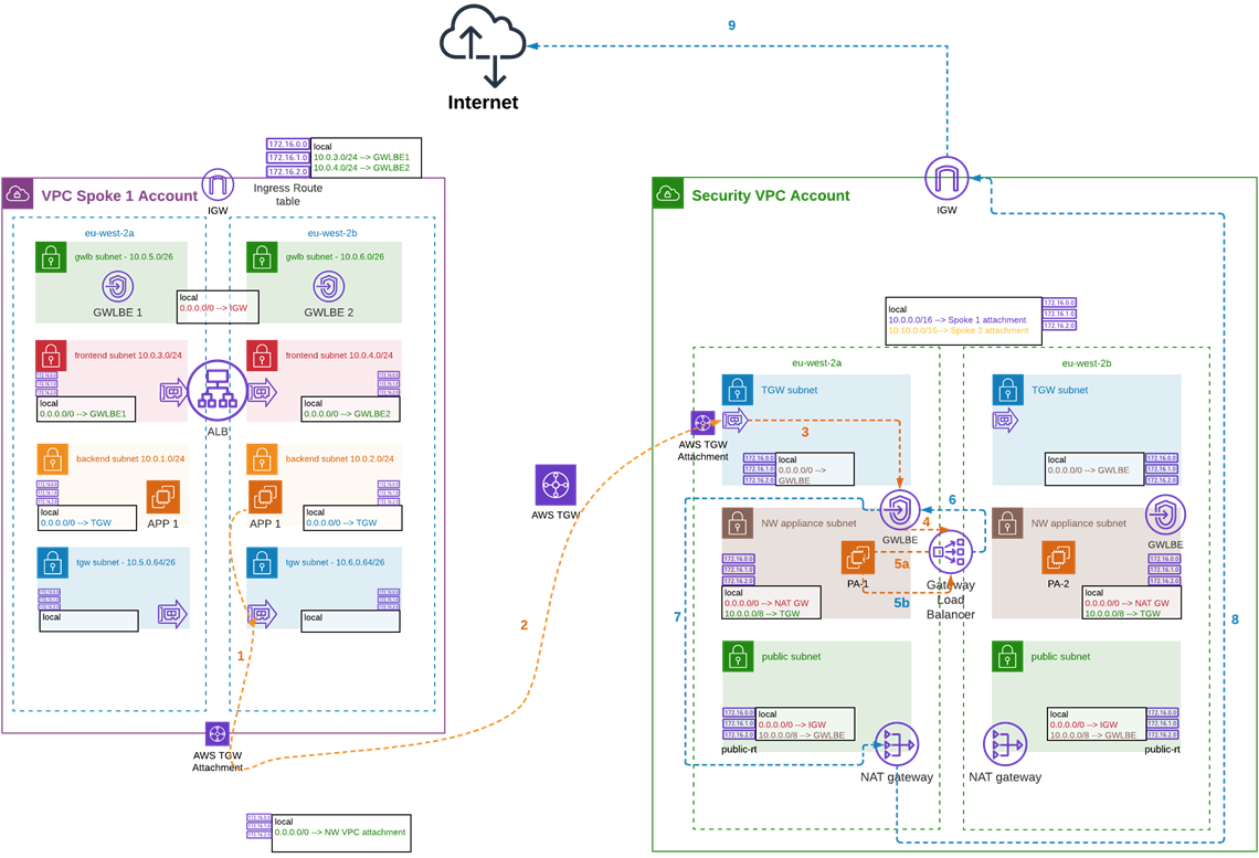 The originating traffic from the instance in the spoke 1 VPC will enter the security VPC through the TGW attachment in AZ X and be inspected from the appliance residing in the same AZ X. If the firewall permits the traffic, it will send back to the same TGW ENI and exit towards its destination through the AZ it came.