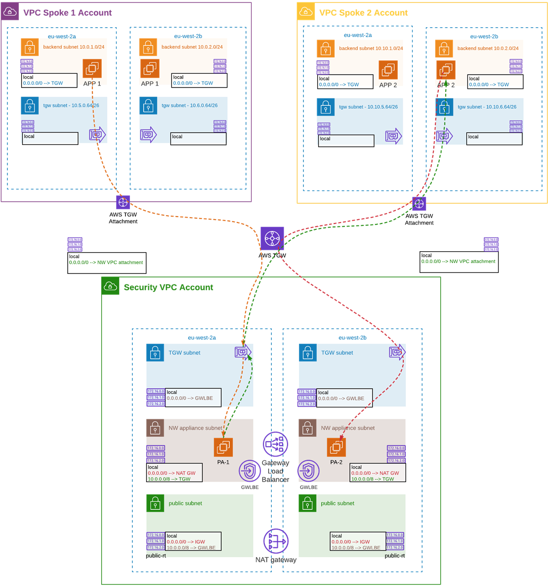 We should take into account this may lead to additional cost from the one described above, as we’ll need to create distinctive GWLB endpoints for each leg. We must also take into account the inbound and outbound endpoints will be multiplied by the number of AZs in which our solution is operating.