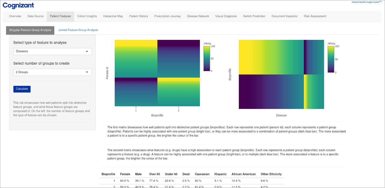 - The first Bioprofile plot highlights how well patients split into distinctive patient groups, and the second Feature Association plot showcases what features (example: disease) have a high association to each patient group (bio profile).