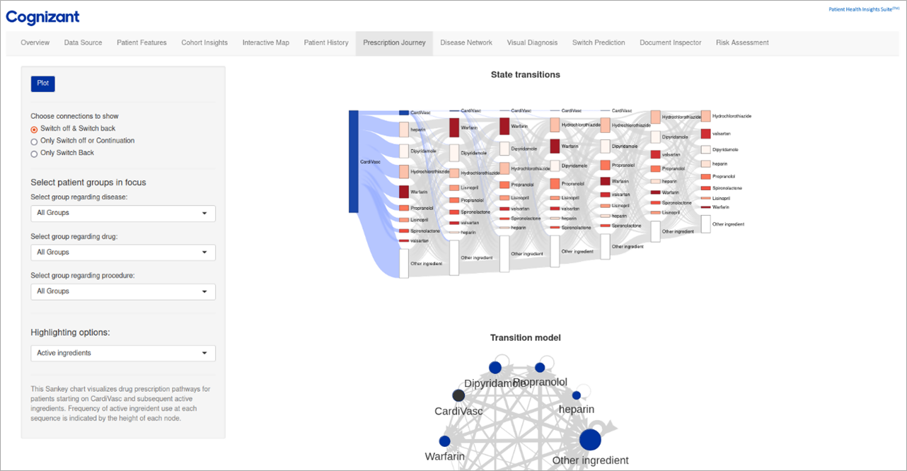 It also facilitates forecasting, analysis, and decision-making by visualizing the prescription journey for selected groups of individuals. Further, this module employs predictive analytics to project future prescription behaviors, offering insights into two key aspects: “Switch Off” and “Continuation” methods.